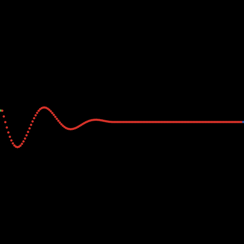 turtles-own [ yvel ;; velocity along the y axis ypos ;; y position (separate from ycor since we might exceed the boundaries of ;; the world, which ycor can never do) ] to setup clear-all set-default-shape turtles "circle" create-turtles world-width [ set xcor who set color red set size 1.5 ;; easier to see if pxcor = max-pxcor [ set color blue ] ;; rightmost turtle is blue if pxcor = min-pxcor [ set color green ] ;; leftmost turtle is green ] reset-ticks end to go ask turtles with [color = green] ;; the green turtle is the driving force [ ifelse ticks > 100 ;; ramp the force up gradually to avoid spikes in the wave [ set ypos amplitude * sin (frequency * ticks) ] [ set ypos (ticks / 100) * amplitude * sin (frequency * ticks) ] ifelse patch-at 0 (ypos - ycor) != nobody ;; hide turtles outside the visible world [ set ycor ypos st ] [ ht ] ] ask turtles with [color = red] ;;the red turtles respond to their neighbors' positions [ ;; make your new y velocity equal to your old one + the average pos of your two neighbors set yvel yvel + ((([ypos] of (turtle (who - 1))) - ypos) + (([ypos] of (turtle (who + 1))) - ypos)) set yvel ((1000 - friction) / 1000) * yvel ;; apply friction ] ;; we need two separate ask blocks here so all the turtles calculate their ;; new velocities before any turtles move ask turtles with [color = red] [ ;; calculate new y position set ypos ypos + yvel ;; calculate new y position ifelse patch-at 0 (ypos - ycor) != nobody ;; hide turtles outside the visible world [ set ycor ypos show-turtle ] [ hide-turtle ] ] tick end ; Copyright 1997 Uri Wilensky. ; See Info tab for full copyright and license.
