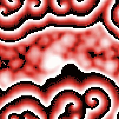 Each cell has a state which is an integer from 0 to max-state. We choose to show state 0 as black, max-state as white, and intermediate states as shades of red.