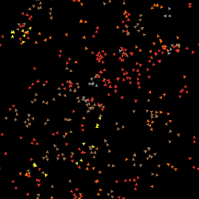 to setup clear-all crt number [ set color 5 + (random colors) * 10 if color = turquoise ;; turquoise (75) is too similar to another color [ set color magenta ] ;; so use magenta (125) instead setxy random-xcor random-ycor ] reset-ticks end to go if variance [color] of turtles = 0 [ stop ] ask turtles [ rt random 50 lt random 50 fd 1 ] birth death tick end ;; turtles hatch between 0 and 4 babies to birth ask turtles [ hatch random 5 [ fd 1 ] ] end ;; if the overall population is greater than the original number, ;; randomly kill turtles to keep population roughly constant to death let total-turtles count turtles ask turtles [ if random total-turtles > number [ die ] ] end ; Copyright 1997 Uri Wilensky. ; See Info tab for full copyright and license.