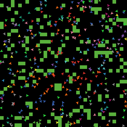 turtles-own [energy] ;; for keeping track of when the turtle is ready ;; to reproduce and when it will die to setup clear-all setup-patches setup-turtles reset-ticks end to setup-patches ask patches [ set pcolor green ] end to setup-turtles create-turtles number ;; uses the value of the number slider to create turtles ask turtles [ setxy random-xcor random-ycor ] end to go if ticks >= 500 [ stop ] ;; stop after 500 ticks move-turtles eat-grass check-death reproduce regrow-grass tick ;; increment the tick counter and update the plot end to move-turtles ask turtles [ right random 360 forward 1 set energy energy - 1 ;; when the turtle moves it looses one unit of energy ] end to eat-grass ask turtles [ if pcolor = green [ set pcolor black ;; the value of energy-from-grass slider is added to energy set energy (energy + energy-from-grass) ] ifelse show-energy? [ set label energy ] ;; the label is set to be the value of the energy [ set label "" ] ;; the label is set to an empty text value ] end to reproduce ask turtles [ if energy > birth-energy [ set energy energy - birth-energy ;; take away birth-energy to give birth hatch 1 [ set energy birth-energy ] ;; give this birth-energy to the offspring ] ] end to check-death ask turtles [ if energy <= 0 [ die ] ;; removes the turtle if it has no energy left ] end to regrow-grass ask patches [ ;; 3 out of 100 times, the patch color is set to green if random 100 < 3 [ set pcolor green ] ] end ; Public Domain: ; To the extent possible under law, Uri Wilensky has waived all ; copyright and related or neighboring rights to this model.