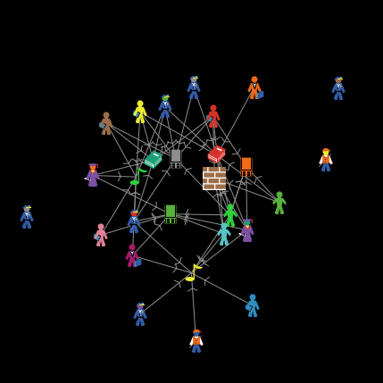 breed [users user] breed [objects object] to setup ca end to users-create create-ordered-users 20 [ set shape item random length ["person" "person business" "person construction" "person graduate" "person police" "person student" ] ["person" "person business" "person construction" "person graduate" "person police" "person student" ] set size 2 fd 5 + random 5] end to objects-create create-ordered-objects 8 [ set shape item random length ["computer server" "book" "music notes 3" "tile brick"] ["computer server" "book" "music notes 3" "tile brick"] set size 2 fd 5 + random 2] end to connect ask users [create-links-to min-n-of (random count objects) objects [distance myself]] end to lay repeat 50 [ layout-spring turtles links 0.2 5 1 ] end
