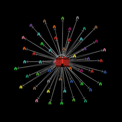 breed [ companies company ] breed [ associations association ] breed [ courts court ] directed-link-breed [ jurisdictions jurisdiction ] directed-link-breed [ memberships membership ] companies-own [policy] to setup clear-all create-companies 50 [ set shape "house" ] create-associations 1 [ set shape "circle 2" set size 2 ] create-courts 1 [ set shape "building institution" set size 3.5 ] create-network reset-ticks end to create-network ask courts [ ask companies [ create-jurisdiction-from myself] ] ask companies [ create-membership-to one-of associations ] repeat 30 [ layout-spring turtles links 0.2 5 1 ] end to go ask courts [ determine-compliance-standards sanction-non-compliers ] ask companies [ adjust-policies ] ; advise end to determine-compliance-standards ask companies [] ;; I don't think I want courts to ask all companies equally ;; I think some get more attention/weight than others end to sanction-non-compliers ;; if companies are out of compliance, sanction them end to adjust-policies ask companies [ ;; take wisdom from professionals ;; follow market rationality/guess what courts will do ] end ;to advise ; ask associations ; [] ; ;end