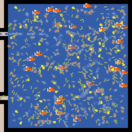 ;;; Asmaa aljuhani ;;; Agent Based Modeling ;; Aquaponics breed [fish a-fish] breed [water a-water] breed [Nitrosomonas a-Nitrosomonas] ; convert ammonia (brown) to Nitrites (yellow) breed [Nitrobacter a-Nitrobacter] ; conver Nitrites (yellow) to Nitrates (Green) water-own [ head-to ;; this variable is to arrange the flow of water ( to make crossing tunnels easy) clean ;; this variable holds arrange of int from 1-5 (1 is clean and 5 is toxic) nitrites? nitrates? ] fish-own [ tank ;; variable that hold how the amount of food a fish eat ;;if it reach the max-amount-0f-food-afish-can-eat fish will stop eat waste ;; amount of waste a-fish produce ] Nitrosomonas-own [ life-span] Nitrobacter-own [life-span] globals[ window-edge day day-change? t2b-entrance b2t-exit ] to setup ca ask patches [set pcolor brown + 3] draw-tank draw-walls draw-tunnels set t2b-entrance tank-to-bed-tunnel-entrance set b2t-exit bed-to-tank-tunnel-exit set day-change? false ;;;create fish create-fish number-of-fish [ set shape "fish" set color orange set size 2 set tank 0 set waste 0 arrange-within-tank ] ;;;create water create-water tank-size * 50 [ set shape "drop" set color scale-color (blue) ((random-float 2.0) + 5) 0 10 set size 1 set clean 1 set nitrites? false set nitrates? false arrange-within-tank ] reset-ticks end to go ask fish [ swim produce-ammonia ] ask water[ circulate grow-Nitrosomonas grow-Nitrobacter cross-tunnels recolor ;; to recolor water depends on how clean it is ] if any? Nitrosomonas [ ask Nitrosomonas [ swim convert-ammonia-to-Nitrites calculate-life-span ] ] if any? Nitrobacter [ ask Nitrobacter [ swim convert-Nitrites-to-Nitrates calculate-life-span ] ] ifelse ticks mod 100 = 0 [ set day day + 1 set day-change? true ] [ set day-change? false ] tick end ;;;;;;;;;;;;;;;;;;;;;;;;; setup functions ;;;;;;;;;;;;;;;;;;;;;;;;;;;;;;;;;;;;;;;;; to draw-tank ask patches [ set pcolor blue ;scale-color (blue) ((random-float 2.0) + 5) 0 10 ] end to draw-walls ask patches with [pxcor = max-pycor or pxcor = min-pycor + 1 or pycor = max-pxcor or pycor = min-pxcor] [ set pcolor black ] ask patches with [pxcor = min-pycor] [ set pcolor brown + 3 ] end to draw-tunnels ask patches with [(pycor = max-pycor / 2 + 1 or pycor = max-pycor / 2 - 1) or (pycor = (- max-pycor / 2 + 1) or pycor =(- max-pycor / 2 - 1))] [ if (pxcor <= min-pycor + 1 )[ set pcolor black ] ] ask patches with [pycor = max-pycor / 2 or pycor = (- max-pycor / 2)] [ if (pxcor <= min-pycor + 1 )[ set pcolor brown + 3 ] ] end ;; turtle procedure that randomizes position on the tanks to arrange-within-tank setxy random-xcor random-ycor if any? patches in-radius 2 with [pcolor = black or pcolor = brown + 3] [ arrange-within-tank ] ;; try again until we don't land on or near black end ;;; ;;; ;;; turtles procedures ;;; ;;; ;;; ;;;;;;;;;;;;;;;;;;;;;;;;;;;;;;;;;;;;;FISH PROCEDURS;;;;;;;;;;;;;;;;;;;;;;;;;;;;;;;;;;;;;;;;; ;;;turtle procedure that let fish to swim within the tank to swim fd 1 rt 3 if any? patches in-radius 2 with [pcolor = black] [ rt 180 ] end to produce-ammonia let drops one-of water in-radius (size / 2) if drops != nobody and random 10 = 5 [ set waste waste - 1 ask drops [ if clean < 5 [ set clean (clean + 1) ] ] ] end to empty-fish-tank ask fish [ set tank 0 ] end to grow-produce if day-change? [ set size size + .01 ] end ;;;;;;;;;;;;;;;;;;;;;;;;;;;;;;;;;;;;;WATER PROCEDURS;;;;;;;;;;;;;;;;;;;;;;;;;;;;;;;;;;;;;;;;; to circulate if ( head-to = 0) [ flow ] ;; for water in the lower part of the tank --> move towards the tunnel if (random 10 = 1 and floor ycor = [pycor] of t2b-entrance); max-pycor / -3 and xcor > max-pxcor / 3) [ face t2b-entrance set head-to t2b-entrance ; set color red ] if (head-to = b2t-exit and ycor > 0 and xcor > min-pxcor / 2) [ set head-to 0 ] ;; for water in the upper part of the grow-bed --> move towards the tunnle if (random 10 = 1 and floor ycor = [pycor] of b2t-exit and xcor < 0) [ face b2t-exit set head-to b2t-exit ; set color yellow ] end to flow fd 1 rt random 10 if any? patches in-radius 2 with [pcolor = black][ rt 180 ] end to cross-tunnels if (head-to = t2b-entrance or head-to = b2t-exit ) [ fd 1 if ( xcor < min-pxcor + .5) [ set ycor [pycor] of b2t-exit ; set color green set heading 90 set head-to b2t-exit ;; return clean water set clean 1 set nitrites? false set nitrates? false ] ] end to recolor ifelse clean > 1 and (not nitrites?) and (not nitrates?) [ set color scale-color (brown) (( 2.0) + 5) clean 10 ] [ ifelse nitrites? [ set color yellow ] [ ifelse nitrates? [ set color green - 1 ] [ set color scale-color (blue) ((random-float 2.0) + 5) 0 10 ] ] ] end ;;;;;;;;;;;;;;;;;;;;;;;;;;;;;;;;;;;;;BACTERIA PROCEDURS;;;;;;;;;;;;;;;;;;;;;;;;;;;;;;;;;;;;;;;;; to grow-Nitrosomonas if all? water in-radius 2 [clean > 1] [ hatch-Nitrosomonas 1[ set shape "bacteria" set color blue set size 1 set life-span bacteria-life-span * 100 ] ] end to grow-Nitrobacter if all? water in-radius 2 [nitrites?] [ hatch-Nitrobacter 1[ set shape "bacteria2" set color pink set size 1 set life-span bacteria-life-span * 100 ] ] end to convert-ammonia-to-Nitrites let drops water with [clean > 2] in-radius 1 if drops != nobody [ ask drops [ set nitrites? true ] ] end to convert-Nitrites-to-Nitrates let drops water with [nitrites?] in-radius 1 if drops != nobody [ ask drops [ set nitrites? false set nitrates? true ] ] end to calculate-life-span ifelse life-span > 1 [ set life-span life-span - 1 ] [ die ] end ;;;;;;;;;;;;;;;;;;;;;;;;;;;;;;;;;;;;;;;;;;;;;;;;;;;;;;;;;;;;;;;;;;;;;;;;;;;;;;;;;;;;;;;;;;;;;;;; ;;; ;;; ;;; helper reporters ;;; ;;; ;;; to-report tank-to-bed-tunnel-entrance report patch ((min-pxcor ) ) (max-pycor / -2) end to-report bed-to-tank-tunnel-exit report patch ((max-pxcor)) (max-pycor / 2) end