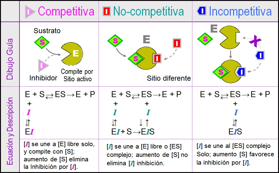 Resulta interesante estudiar la acción de inhibidores sobre la cinética enzimática. Existen distintos tipos de inhibición reversible, como los que se muestran a continuación: