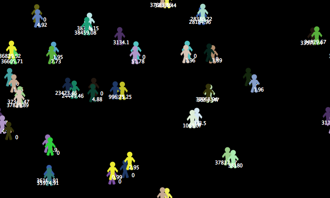 This model demonstrates my theory for the accumulation of knowledge through conversation. The idea is that people gain knowledge when they listen, and don't when they don't listen, as in they are either talking or walking around. If they are talking to someone they are similar to, they will be more interested in talking, but will learn less from the conversation. If they are talking to someone they are not very similar to, they will be less interested in talking, but will learn more from the conversation. Accordently, they will have a longer attention span and space out for a shorter period of time with someone more similar, and vice versa for someone less similar. After a certain period when no one has spoken, they will part ways and find someone new to talk to.