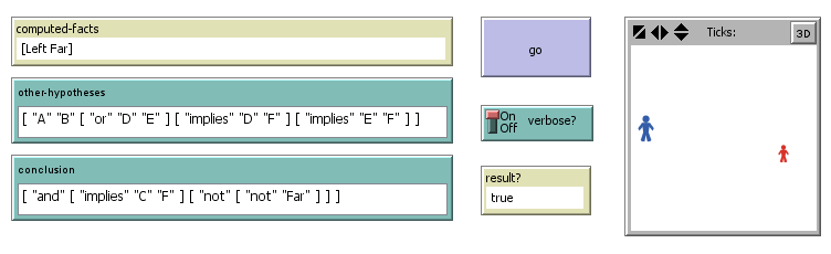 ; © Anthony Dekker, written for a tutorial at scientificgems.wordpress.com globals [ computed-facts result? ] to go if (verbose?) [ print "------------------------------------------------------------------------" ] clear-all ask patches [ set pcolor white ] create-turtles 1 [ set color blue set size 3 set shape "person" setxy random-xcor random-ycor ] create-turtles 1 [ set color red set size 2 set shape "person" setxy random-xcor random-ycor ] set result? "?" ask (turtle 0) [ compute-basic-facts ] let hypotheses (sentence computed-facts (read-from-string other-hypotheses)) set result? sequent-prove-a [] hypotheses [] (list (read-from-string conclusion)) end to compute-basic-facts ; calculated by a specific turtle let fact1 (ifelse-value (xcor < 0) [ "Left" ] [ "Right" ]) let d (distance (turtle 1)) let fact2 (ifelse-value (d < 4) [ "Near" ] [ "Far" ]) set computed-facts (list fact1 fact2) end to-report sequent-prove-a [ atomic-hyp non-at-hyp atomic-conc non-at-conc ] ; split hypotheses nice-print "a" atomic-hyp non-at-hyp atomic-conc non-at-conc "" ifelse (non-at-hyp = []) [ report sequent-prove-b atomic-hyp atomic-conc non-at-conc ] [ let p (first non-at-hyp) set non-at-hyp (but-first non-at-hyp) ifelse (is-string? p) ; atomic [ report sequent-prove-a (fput p atomic-hyp) non-at-hyp atomic-conc non-at-conc ] [ ifelse (first p = "not") ; not q [ let q (item 1 p) report sequent-prove-a atomic-hyp non-at-hyp atomic-conc (fput q non-at-conc) ] [ ifelse (first p = "and") ; q /\ r [ let q (item 1 p) let r (item 2 p) report sequent-prove-a atomic-hyp (fput q (fput r non-at-hyp)) atomic-conc non-at-conc ] [ ifelse (first p = "or") ; q \/ r [ let q (item 1 p) let r (item 2 p) ;print "fork on hypothesis v" report (sequent-prove-a atomic-hyp (fput q non-at-hyp) atomic-conc non-at-conc) and (sequent-prove-a atomic-hyp (fput r non-at-hyp) atomic-conc non-at-conc) ] [ ifelse (first p = "implies") ; same as (not q) \/ r [ let q (item 1 p) let r (item 2 p) ;print "fork on hypothesis ->" report (sequent-prove-a atomic-hyp (fput r non-at-hyp) atomic-conc non-at-conc) and (sequent-prove-a atomic-hyp non-at-hyp atomic-conc (fput q non-at-conc)) ] [ error "Unexpected logical" ] ] ] ] ] ] end to-report sequent-prove-b [ atomic-hyp atomic-conc non-at-conc ] ; split conclusions nice-print "b" atomic-hyp [] atomic-conc non-at-conc "" ifelse (non-at-conc = []) [ report sequent-prove-c atomic-hyp atomic-conc ] [ let p (first non-at-conc) set non-at-conc (but-first non-at-conc) ifelse (is-string? p) ; atomic [ report sequent-prove-b atomic-hyp (fput p atomic-conc) non-at-conc ] [ ifelse (first p = "not") ; not q [ let q (item 1 p) report sequent-prove-a atomic-hyp (list q) atomic-conc non-at-conc ] [ ifelse (first p = "and") ; q /\ r [ let q (item 1 p) let r (item 2 p) ;print "fork on conclusion ^" report (sequent-prove-b atomic-hyp atomic-conc (fput q non-at-conc)) and (sequent-prove-b atomic-hyp atomic-conc (fput r non-at-conc)) ] [ ifelse (first p = "or") ; q \/ r [ let q (item 1 p) let r (item 2 p) report sequent-prove-b atomic-hyp atomic-conc (fput q (fput r non-at-conc)) ] [ ifelse (first p = "implies") ; same as (not q) \/ r [ let q (item 1 p) let r (item 2 p) report sequent-prove-a atomic-hyp (list q) atomic-conc (fput r non-at-conc) ] [ error "Unexpected logical" ] ] ] ] ] ] end to-report sequent-prove-c [ atomic-hyp atomic-conc ] let proved? false foreach atomic-conc [ if ((not proved?) and member? ? atomic-hyp) [ set proved? true ] ] ifelse (proved?) [ nice-print " c" atomic-hyp [] atomic-conc [] " ** proved **" ] [ nice-print " c" atomic-hyp [] atomic-conc [] " failed!" ] report proved? end to-report nice-item [ p ] ifelse (is-string? p) [ report p ] [ ifelse (first p = "not") [ let q (item 1 p) report (word "~ " (nice-item q)) ] [ ifelse (first p = "and") [ let q (item 1 p) let r (item 2 p) report (word "(" (nice-item q) " ^ " (nice-item r) ")") ] [ ifelse (first p = "or") [ let q (item 1 p) let r (item 2 p) report (word "(" (nice-item q) " v " (nice-item r) ")") ] [ ifelse (first p = "implies") [ let q (item 1 p) let r (item 2 p) report (word "(" (nice-item q) " -> " (nice-item r) ")") ] [ error "Unexpected logical" ] ] ] ] ] end to-report nice-list [ p ] ifelse (p = []) [ report "" ] [ report (reduce [ (word ?1 ", " ?2) ] (map nice-item p)) ] end to nice-print [ lab x y z w t] if (verbose?) [ print (word lab ": " (nice-list (sentence x y)) " |- " (nice-list (sentence z w)) t) ] end