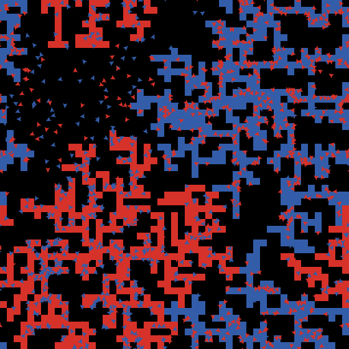 turtles-own [ life ] to setup ca crt population [ set color one-of [ red blue ] setxy random-xcor random-ycor ] ask patch 12 12 [ set pcolor blue ] ask patch -12 -12 [ set pcolor red ] reset-ticks end to go ask turtles with [ pcolor = black ] [ let my-color color ifelse any? neighbors4 with [ pcolor = my-color ] [ set pcolor my-color die ] [ set life life + 1 rt random 30 lt random 30 fd 0.5 ] ] tick end