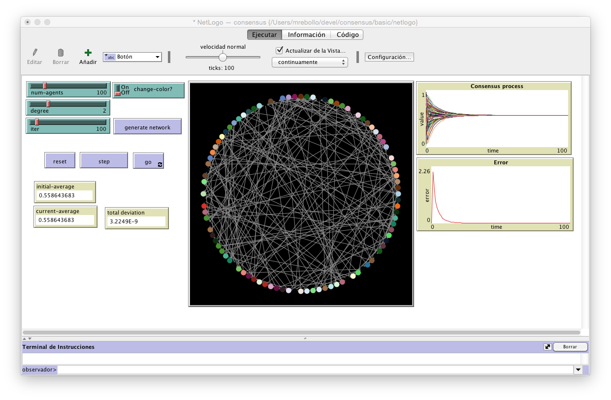 Then GENERATE NEWORK creates a random network with the defined parameters and inits the value of each agents uniformly in [0,1]