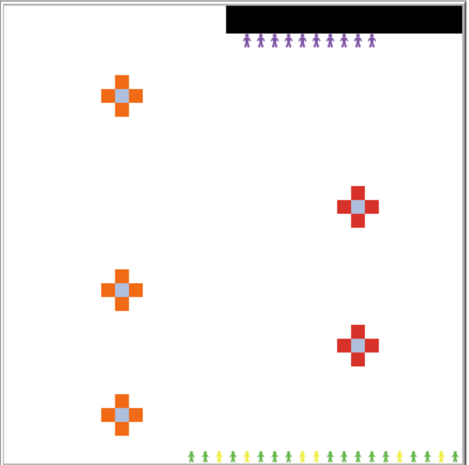 turtles-own [counting order_serving_time order_food ] globals [ student_patches counter_patches table_patches1 table_patches2 table_patches3 table_patches4 ] breed [waiters waiter] to setup clear-all setup-cafeteria reset-ticks end to setup-cafeteria make-tables make-students make-waiters end to make-tables ask patches [ set pcolor white ] set counter_patches patches with [ pxcor >= 0 and pycor > 14 ] ask counter_patches [ set pcolor black ] set table_patches1 patches with [ pxcor = -8 and pycor = 10 ] ask table_patches1 [ set pcolor blue + 3 ask neighbors4 [ set pcolor orange ] ] set table_patches2 patches with [ pxcor = -8 and pycor = -13 ] ask table_patches2 [ set pcolor blue + 3 ask neighbors4 [ set pcolor orange ] ] set table_patches3 patches with [ pxcor = -8 and pycor = -4 ] ask table_patches3 [ set pcolor blue + 3 ask neighbors4 [ set pcolor orange ] ] set table_patches4 patches with [ pxcor = 9 and pycor = 2 ] ask table_patches4 [ set pcolor blue + 3 ask neighbors4 [ set pcolor red ] ] set table_patches4 patches with [ pxcor = 9 and pycor = -8 ] ask table_patches4 [ set pcolor blue + 3 ask neighbors4 [ set pcolor red ] ] end to make-students set-default-shape turtles "person" create-ordered-turtles no_of_students [ set color one-of [green yellow] set xcor -3 + who set ycor -16 set size 0.8 ;;move-to-empty-one-of student_patches ] ask n-of ( int (percentage_girl_order / 100 * count turtles with [color = yellow ])) turtles [ move-to-food ] ask n-of ( int (percentage_boy_order / 100 * count turtles with [color = green ])) turtles [ move-to-food ] ;;move-to-empty-one-of student_patches end to move-same-students set size 1 set heading 0 setxy (10 + random -22) min-pycor end to make-waiters create-waiters number-of-waiters [ set shape "person" set color violet set size 1 set xcor 14 + who set ycor 14 ] end to go if ticks >= 500 [stop] ask turtles [ move-students move-waiters ] tick end to move-students ask turtles with [color = green ] [ ifelse pcolor != orange [move] [stay] ] ask turtles with [color = yellow ] [ ifelse pcolor != red [move] [stay] ] ask turtles with [color = violet ] [ ifelse pcolor != black [move] [stay] ] end To move lt random 10 rt random 10 fd 1.5 end to stay set counting counting - 1 if counting = 0 [ stay reset-counting ] end to reset-counting set counting waiting_time end to move-waiters ask waiters [ rt random 5 lt random 5 ] end to move-to-food let targ one-of patches with[pcolor = black] set order_serving_time serving_time set order_food random 3 end