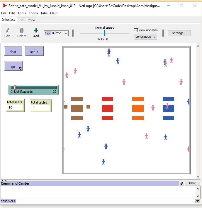patches-own [ tables chairs ] to clear clear-all end to setup clear-all ask patches [ set pcolor white ] setup-turtles setup-patches reset-ticks end to go ; setup-turtles move-turtles tick end to setup-turtles ; create-turtles with different number by slider create-turtles Initial-Students [ choose-sex ;; Male Or Femail set size 1.5 ] ask turtles [ setxy random-xcor random-ycor set shape "person" ] end to choose-sex ;; turtle procedure set color one-of [pink blue] end to setup-patches ask patches [ setup-tables ] end to move-turtles ask turtles [ right random 360 fd 1 ; set energy energy - 1 ; pen-down ] end to setup-tables let x pxcor let y pycor ;============================= Tables 1================================================ ask patches with [pxcor > -15 and pxcor < -11 and pycor = 1 ] [ set pcolor brown ] ask patches with [pxcor > -15 and pxcor < -11 and pycor = 0 ] [ set pcolor brown ] ;============================= Chair 1================================================ ask patches with [pxcor > -15 and pxcor < -11 and pycor = 3 ] [ set pcolor brown ] ask patches with [pxcor > -15 and pxcor < -11 and pycor = -2 ] [ set pcolor brown ] ask patches with [pxcor > -11 and pxcor < -9 and pycor = 1 ] [ set pcolor brown ] ask patches with [pxcor > -17 and pxcor < -15 and pycor = 1 ] [ set pcolor brown ] ;=================================Table 2============================================ ask patches with [pxcor > -7 and pxcor < -3 and pycor = 1 ] [ set pcolor red ] ask patches with [pxcor > -7 and pxcor < -3 and pycor = 0 ] [ set pcolor red ] ;=================================Chair 2============================================ ask patches with [pxcor > -7 and pxcor < -3 and pycor = 3 ] [ set pcolor red ] ask patches with [pxcor > -7 and pxcor < -3 and pycor = -2 ] [ set pcolor red ] ;===============================Table 3============================================== ask patches with [pxcor > 1 and pxcor < 5 and pycor = 1 ] [ set pcolor orange ] ask patches with [pxcor > 1 and pxcor < 5 and pycor = 0 ] [ set pcolor orange ] ;==========================Chair3 ============================================== ask patches with [pxcor > 1 and pxcor < 5 and pycor = 3 ] [ set pcolor orange ] ask patches with [pxcor > 1 and pxcor < 5 and pycor = -2 ] [ set pcolor orange ] ;=============================Table 4================================================ ask patches with [pxcor > 9 and pxcor < 13 and pycor = 1 ] [ set pcolor blue ] ask patches with [pxcor > 9 and pxcor < 13 and pycor = 0 ] [ set pcolor blue ] ;; ===========================Chair 4 ========================================== ask patches with [pxcor > 9 and pxcor < 13 and pycor = 3 ] [ set pcolor blue ] ask patches with [pxcor > 9 and pxcor < 13 and pycor = -2 ] [ set pcolor blue ] end