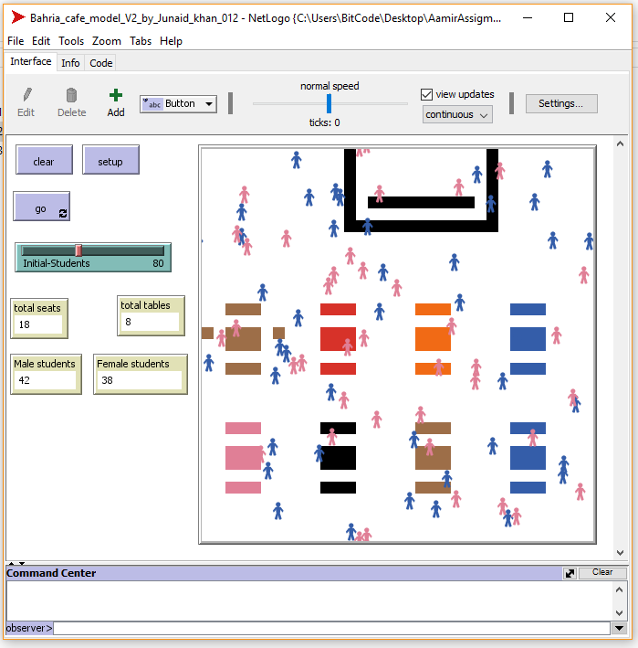 patches-own [ tables chairs ] to clear clear-all end to setup clear-all ask patches [ set pcolor white ] setup-turtles setup-patches reset-ticks end to go ;setup-turtles move-turtles tick end to setup-turtles ; create-turtles with different number by slider create-turtles Initial-Students [ choose-sex ;; become a man or a woman set size 1.5 ;; be easier to see ] ask turtles [ setxy random-xcor random-ycor set shape "person" ] end to choose-sex ;; turtle procedure set color one-of [pink blue] end to setup-patches ask patches [ setup-tables ] end to move-turtles ask turtles [ right random 360 fd 1 ; set energy energy - 1 ; pen-down ] end to setup-tables let x pxcor let y pycor ; Cafe Counter ;============================================================================= ask patches with [pxcor > -5 and pxcor < 9 and pycor = 10 ] [ set pcolor black ] ask patches with [pxcor > -3 and pxcor < 7 and pycor = 12 ] [ set pcolor black ] ask patches with [pxcor = -4 and pycor > 10 and pycor < 21 ] [ set pcolor black ] ask patches with [pxcor = 8 and pycor > 10 and pycor < 21 ] [ set pcolor black ] ;============================= Tables 1================================================ ask patches with [pxcor > -15 and pxcor < -11 and pycor = 1 ] [ set pcolor brown ] ask patches with [pxcor > -15 and pxcor < -11 and pycor = 0 ] [ set pcolor brown ] ;============================= Chair 1================================================ ask patches with [pxcor > -15 and pxcor < -11 and pycor = 3 ] [ set pcolor brown ] ; downside chairs------------------------------------------------------ ask patches with [pxcor > -15 and pxcor < -11 and pycor = -2 ] [ set pcolor brown ] ask patches with [pxcor > -11 and pxcor < -9 and pycor = 1 ] [ set pcolor brown ] ask patches with [pxcor > -17 and pxcor < -15 and pycor = 1 ] [ set pcolor brown ] ;=================================Table 2============================================ ask patches with [pxcor > -7 and pxcor < -3 and pycor = 1 ] [ set pcolor red ] ask patches with [pxcor > -7 and pxcor < -3 and pycor = 0 ] [ set pcolor red ] ;=================================Chair 2============================================ ask patches with [pxcor > -7 and pxcor < -3 and pycor = 3 ] [ set pcolor red ] ; downside chairs-------------------------------------------------- ask patches with [pxcor > -7 and pxcor < -3 and pycor = -2 ] [ set pcolor red ] ;===============================Table 3============================================== ask patches with [pxcor > 1 and pxcor < 5 and pycor = 1 ] [ set pcolor orange ] ask patches with [pxcor > 1 and pxcor < 5 and pycor = 0 ] [ set pcolor orange ] ;==========================Chair3 ============================================== ask patches with [pxcor > 1 and pxcor < 5 and pycor = 3 ] [ set pcolor orange ] ; downside chairs-------------------------------------------------- ask patches with [pxcor > 1 and pxcor < 5 and pycor = -2 ] [ set pcolor orange ] ;=============================Table 4================================================ ask patches with [pxcor > 9 and pxcor < 13 and pycor = 1 ] [ set pcolor blue ] ask patches with [pxcor > 9 and pxcor < 13 and pycor = 0 ] [ set pcolor blue ] ;; ===========================Chair 4 ========================================== ask patches with [pxcor > 9 and pxcor < 13 and pycor = 3 ] [ set pcolor blue ] ; downside chairs-------------------------------------------------- ask patches with [pxcor > 9 and pxcor < 13 and pycor = -2 ] [ set pcolor blue ] ;===========================table 5================================================== ask patches with [pxcor > -15 and pxcor < -11 and pycor = -9 ] [ set pcolor pink ] ask patches with [pxcor > -15 and pxcor < -11 and pycor = -10 ] [ set pcolor pink ] ;=========================Chair 5 ============================================ ask patches with [pxcor > -15 and pxcor < -11 and pycor = -7 ] [ set pcolor pink ] ask patches with [pxcor > -15 and pxcor < -11 and pycor = -12 ] [ set pcolor pink ] ;=============================table 6================================================ ask patches with [pxcor > -7 and pxcor < -3 and pycor = -9 ] [ set pcolor black ] ask patches with [pxcor > -7 and pxcor < -3 and pycor = -10 ] [ set pcolor black ] ; ==============================Charir 6 ==================================== ask patches with [pxcor > -7 and pxcor < -3 and pycor = -7 ] [ set pcolor black ] ; downside chairs----------------------------------------------------- ask patches with [pxcor > -7 and pxcor < -3 and pycor = -12 ] [ set pcolor black ] ;============================table 7================================================= ask patches with [pxcor > 1 and pxcor < 5 and pycor = -9 ] [ set pcolor brown ] ask patches with [pxcor > 1 and pxcor < 5 and pycor = -10 ] [ set pcolor brown ] ;==========================Chair 7 ========================================== ask patches with [pxcor > 1 and pxcor < 5 and pycor = -7 ] [ set pcolor brown ] ask patches with [pxcor > 1 and pxcor < 5 and pycor = -12 ] [ set pcolor brown ] ;================================Table 8============================================= ask patches with [pxcor > 9 and pxcor < 13 and pycor = -9 ] [ set pcolor blue ] ask patches with [pxcor > 9 and pxcor < 13 and pycor = -10 ] [ set pcolor blue ] ;=================================Chair 8 ====================================== ask patches with [pxcor > 9 and pxcor < 13 and pycor = -7 ] [ set pcolor blue ] ; downside chairs----------------------------------------------------- ask patches with [pxcor > 9 and pxcor < 13 and pycor = -12 ] [ set pcolor blue ] end