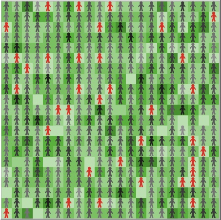 Each patch has a random amount of income (employment income, investment income, etc.). If a randomly assigned income level is negative, it is set to 0. The patches are shaded green in quintiles, with the highest income quintile having the darkest shade of green. This is done once during setup since patch income does not change.