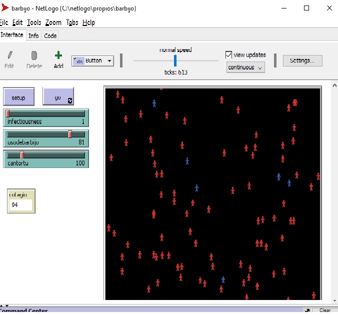 El deslizador de cantortu indica con cuantas tortugas se va a realizar la simulación, el tope máximo es 500. El deslizador usodebarbijo indica qué porcentaje de la población va a usar barbijo. El deslizador infectiousness indica qué porcentaje de la población empieza la simulación ya contagiado. El botón de setup inicializa el mundo, distribuyendo a los agentes al azar y asignando los contagiados y los que usan barbijos. El botón de go comienza la simulación haciendo que los agentes caminen al azar y al toparse unos con otros se decida si se contagian o no.