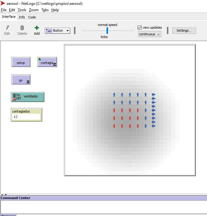 Con el botón "contagia" y haciendo click sobre cada agente se lo contagia y cambia de color a rojo. Se pueden probar con diferentes configuraciones y observar que es lo que sucede en presencia o ausencia del ventilador.