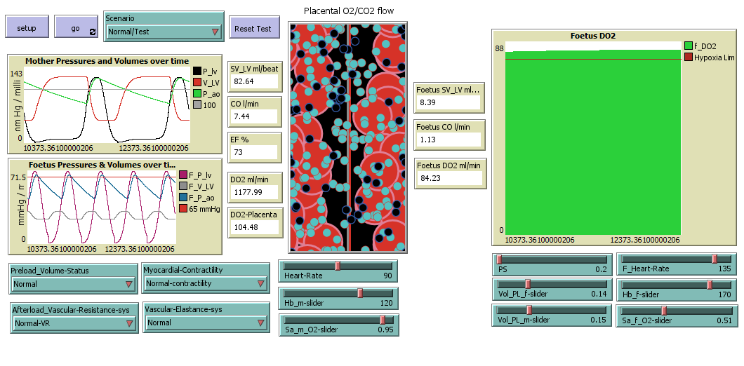 With every tick calculations of variables concerning stocks and flows are performed and values for volumes and pressures are shown on the plots. SV, CO, mother EF and DO2 (in mother and fetus) are reported by respective monitors.