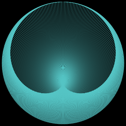 A number of points are distributed uniformly along the circumference of a circle, each labeled with an index arranged in ascending order from 0 to the number set by the slider labeled "modulo". A multiplication table is produced by multiplying the factor set by the slider labeled "mult" and the index of each point modulo the number of points. The result at each point is taken as the index of another point on the circumference and these two points are then joined with a straight line.