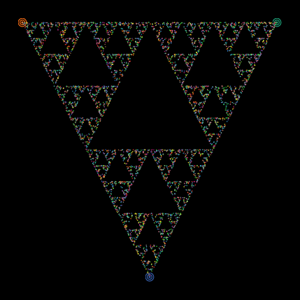 Start with a triangle and many dots, then each dot ramdonly chooses a random vertex of the triangle and moves half the distance towards it in every time step. Note, the topology of the world is flat, not a donut.
