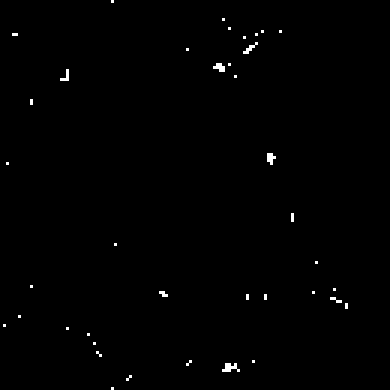 Choose a medium threshold level (such as 4 or 5) and let the model run for about 1500 ticks. The white patterns of activated cells that form have been shown definitively to be fractal in nature (by Viscek and Szalay, 1987). Furthermore, it was shown that the fractal dimension (which gives an indication of the amount to which a fractal fills the space) varies with respect to the THRESHOLD value. This makes sense, and you can see it visually be setting different THRESHOLD values and running the model for a fixed number of ticks.