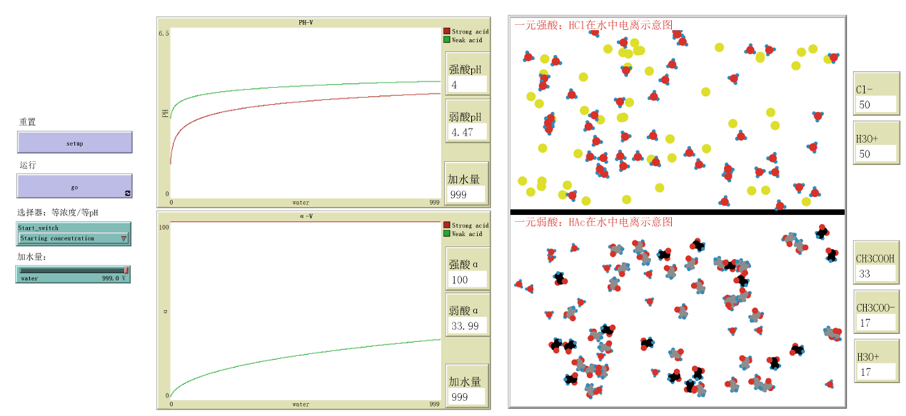 ; Li Ying created this module at Shaanxi Normal University in 2024. If you mention this model in a publication, we ask that you include the citations below. ;Ying, L. (2024). Comparison of Strong and Weak Electrolytes. School of Chemistry and Chemical Engineering, Shaanxi Normal University. breed [ch3cooh_ion mode1_ch3coo_] breed [ch3cooh_molecule mode1_ch3cooh] breed [cl_ion mode1_cl_] breed [h3o_ion_Strong_acid Strong_acid_h3o_] breed [h3o_ion_weak_acid Weak_acid_h3o_] turtles-own [attribute] globals [ Strong_Co Weak_Co Strong_PH Weak_PH Strong_elrpha Weak_elrpha water_cur water_max cl_count h3o_strong_count ch3coo_count ch3cooh_count h3o_weak_count ] ;初始设置 to setup clear-all reset-ticks set-default-shape ch3cooh_ion "mode1_ch3coo_" set-default-shape ch3cooh_molecule "mode1_ch3cooh" set-default-shape cl_ion "mode1_cl_" set-default-shape h3o_ion_Strong_acid "mode1_h3o_" set-default-shape h3o_ion_weak_acid "mode1_h3o_" set water_max water set water_cur 0 ;;起始浓度选择 ifelse Start_switch = "Starting concentration" [ set Strong_Co 0.1 set Weak_Co 0.1 set Strong_elrpha 0 ;;上层窗口初始化,创建cl和H3o模块 create-h3o_ion_Strong_acid (50) [ ; 在 x 范围 (-30, 30) 内生成随机坐标 let random-xcor-xcor (random 58) - 29 ; 在 y 范围 (1, 33) 内生成随机坐标 let random-ycor-ycor random 33 + 1 setxy random-xcor-xcor random-ycor-ycor set size 2.5 ] create-cl_ion (50) [ let random-xcor-xcor (random 58) - 29 ; 在 y 范围 (1, 35) 内生成随机坐标 let random-ycor-ycor random 33 + 1 setxy random-xcor-xcor random-ycor-ycor set size 3 set color (yellow - 0.4) ] ;;下层窗口初始化,创建醋酸分子和醋酸离子 水质子模块 create-ch3cooh_ion (1) [ let random-xcor-xcor (random 58) - 29 ; 在 y 范围 (1, 35) 内生成随机坐标 let random-ycor-ycor random -32 - 2 setxy random-xcor-xcor random-ycor-ycor set size 5 ] create-h3o_ion_weak_acid (1) [ let random-xcor-xcor (random 58) - 29 ; 在 y 范围 (1, 35) 内生成随机坐标 let random-ycor-ycor random -32 - 2 setxy random-xcor-xcor random-ycor-ycor set size 2 ] create-ch3cooh_molecule (49) [ let random-xcor-xcor (random 58) - 29 ; 在 y 范围 (1, 35) 内生成随机坐标 let random-ycor-ycor random -32 - 2 setxy random-xcor-xcor random-ycor-ycor set size 5 ] ] [;;起始PH选择 set Strong_Co 0.001 set Weak_Co 0.05814 set Strong_elrpha 0 ;;上层窗口初始化,创建cl和H3o模块 create-h3o_ion_Strong_acid (2) [ ; 在 x 范围 (-30, 30) 内生成随机坐标 let random-xcor-xcor (random 58) - 29 ; 在 y 范围 (1, 33) 内生成随机坐标 let random-ycor-ycor random 33 + 1 setxy random-xcor-xcor random-ycor-ycor set size 2.5 ] create-cl_ion (2) [ let random-xcor-xcor (random 58) - 29 ; 在 y 范围 (1, 35) 内生成随机坐标 let random-ycor-ycor random 33 + 1 setxy random-xcor-xcor random-ycor-ycor set size 3 set color (yellow - 0.4) ] ;;下层窗口初始化,创建ch3cooh/ch3coo和H3o模块 create-ch3cooh_ion (2) [ let random-xcor-xcor (random 58) - 29 ; 在 y 范围 (1, 35) 内生成随机坐标 let random-ycor-ycor random -32 - 2 setxy random-xcor-xcor random-ycor-ycor set size 4 ] create-h3o_ion_weak_acid (2) [ let random-xcor-xcor (random 58) - 29 ; 在 y 范围 (1, 35) 内生成随机坐标 let random-ycor-ycor random -32 - 2 setxy random-xcor-xcor random-ycor-ycor set size 2.1 ] create-ch3cooh_molecule (130) [ let random-xcor-xcor (random 58) - 29 ; 在 y 范围 (1, 35) 内生成随机坐标 let random-ycor-ycor random -32 - 2 setxy random-xcor-xcor random-ycor-ycor set size 4 ] ] ; 在上半部分设置patches的颜色x:(-30,35)(30,35) y:(35,1) ask patches with [pycor > 0] [ set pcolor white ] ; 在中间部分设置patches的颜色 ask patches with [pycor = 0] [ set pcolor black ] ; 在下半部分设置patches的颜色x:(-300,-355)(300,-355) y:(-1,-355) ask patches with [pycor < 0] [ set pcolor white ] end to go ;;设置强酸elrpha set Strong_elrpha 100 ;;起始浓度选择 if water_cur < water_max[ set water_cur (water_cur + 1 ) calculate_elrpha (Weak_Co / (1 + water_cur)) calculate_Strong_acid_ph water_cur calculate_Weak_acid_ph water_cur ] if ticks mod 10 = 0 [ ask h3o_ion_Strong_acid [ ; 随机选择运动距离和角度 let distance_h30 1 ifelse (ycor > 2) and (ycor < 33) and (xcor > -29) and (xcor < 29) [ set heading random 360 ][ ; 左边墙 ifelse (xcor < -29) [ set heading 90 ][] ; 右边墙 ifelse (xcor > 29) [ set heading 270 ][] ; 下面墙 ifelse (ycor < 2) [ set heading 0 ][] ; 上面墙 ifelse (ycor > 33) [ set heading 180 ][] ; 左上角 ifelse (xcor <= -29) and (ycor >= 33) [ set heading 135 ][] ; 右上角 ifelse (xcor >= 29) and (ycor >= 33) [ set heading 315 ][] ; 左下角 ifelse (xcor <= -29) and (ycor <= 2) [ set heading 45 ][] ; 右下角 ifelse (xcor >= 29) and (ycor <= 2) [ set heading 225 ][] ] fd 1 ] ask cl_ion [ ; 随机选择运动距离和角度 let distance_h30 1 ifelse (ycor > 2) and (ycor < 33) and (xcor > -29) and (xcor < 29) [ set heading random 360 ][ ; 左边墙 ifelse (xcor < -29) [ set heading 90 ][] ; 右边墙 ifelse (xcor > 29) [ set heading 270 ][] ; 下面墙 ifelse (ycor < 2) [ set heading 0 ][] ; 上面墙 ifelse (ycor > 33) [ set heading 180 ][] ; 左上角 ifelse (xcor <= -29) and (ycor >= 33) [ set heading 135 ][] ; 右上角 ifelse (xcor >= 29) and (ycor >= 33) [ set heading 315 ][] ; 左下角 ifelse (xcor <= -29) and (ycor <= 2) [ set heading 45 ][] ; 右下角 ifelse (xcor >= 29) and (ycor <= 2) [ set heading 225 ][] ] fd 1 ] ;下半区间 ask ch3cooh_ion [ ; 随机选择运动距离和角度 let distance_h30 1 ifelse (ycor > -33) and (ycor < -3) and (xcor > -29) and (xcor < 29) [ set heading random 360 ][ ; 左边墙 ifelse (xcor < -29) [ set heading 90 ][] ; 右边墙 ifelse (xcor > 29) [ set heading 270 ][] ; 上面墙 ifelse (ycor > -3) [ set heading 180 ][] ; 下面墙 ifelse (ycor < -33) [ set heading 0 ][] ; 左上角 ifelse (xcor <= -29) and (ycor > -3) [ set heading 135 ][] ; 右上角 ifelse (xcor >= 29) and (ycor
