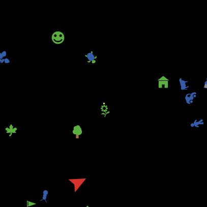 globals [fij mov per ran ran2] breed [fijos fijo] breed [moviles movil] breed [perros perro] breed [marcas marca] to setup clear-all ;ask patches [set pcolor white] set fij ["plant" "tree" "face happy" "flag" "house" "flower" "leaf" "face sad"] set mov ["car" "bug" "butterfly" "cow" "truck" "person" "sheep" "turtle"] create-fijos 7 let c 0 while [c <= 6] [ let x item c fij ask fijo c [set color green set size 2 set xcor random 33 set ycor random 33 set shape x fd random 5] set c c + 1] create-moviles 8 let z 7 while [z <= 14 ] [ let y item (z - 7) mov ask movil z [set color blue set size 2 set xcor random 33 set ycor random 33 set shape y] set z z + 1] create-perros 1 ;ask perros [set color red set size 3 set xcor random 33 set ycor random 33 set shape "wolf"] ask perros [set color red set size 3 set xcor random 33 set ycor random 33] create-marcas 1 ask marcas [ set size 0.25 set shape "circle" set color yellow ] reset-ticks end to go set ran (random (14 - 7) + 7) ask movil ran [rt random 360 repeat random 50[fd 0.25]set heading 0] set ran2 random 14 ask perros [face turtle ran2 repeat (distance turtle ran2) * 4 [fd 0.25] hatch-marcas 1[ set size 0.25 set shape "circle" set color yellow ]] tick end