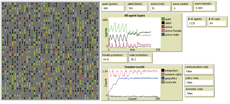 Each agent has several key attributes: - PERCEIVED-HARDSHIP: Assigned randomly at startup, representing individual economic or social difficulties - RISK-AVERSION: Individual tolerance for risk in protest situations - GENDER: Demographic characteristic influencing protest participation (sociology data shows 60-70% female participation in certain protests) - PROTEST-CAUSES: List of causes the agent cares about (immigration, women's rights, geopolitics, corporate/economic) - DIASPORA: Specific community membership (e.g., Ukrainian) that may influence protest decisions - HOME-PATCH: Where the agent typically returns to, creating more realistic movement patterns