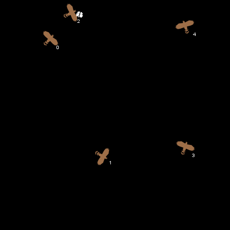 ;; This model was designed by Lilly A. Whitney and Lawrence A. Whitney globals [ wheading ] breed [ bats bat ] breed [ moths moth ] breed [ waves wave ] bats-own [ food ] waves-own [ energy ] to setup clear-all create-bats number-of-bats [ set shape "hawk" set color brown set size 3 setxy random-xcor random-ycor ] ;; Give each bat a consecutive number starting at 0. let num 0 ask bats [ set label num set num num + 1 ] create-moths number-of-moths [ set shape "butterfly 2" set color white set size 1 setxy random-xcor random-ycor ] reset-ticks end to go ask turtles [ if breed = moths [ moth-fly ] if breed = bats [ chirp ;; Has bats create sound waves that help them find moths. bat-fly ;; Has bats fly towards moths that they find using chirp. ] ] if not any? moths [ stop ] tick end to moth-fly set heading heading + ( 360 * random-normal 0 0.1 ) repeat 5 [ ask moths [ fd 0.1 ] display ] end to chirp ;; wave grows outward from bat ;; waves that intersect moth stop, all others die ;; bat turns to face waves/moth let degree 0 ;; creates a wave of 72 agents, 1 agent per 5 degrees hatch-waves 72 [ set shape "dot" set size 0.5 set color 96 set label "" set energy wave-energy set heading heading + degree set degree degree + 5 ] ;; Wave moves outward until it hits a moth. ;; Energy is how far a wave can go before it dies out. loop [ ifelse count waves > 1 [ ask waves [ if energy < 1 [ die ] fd 0.3 display set energy energy - 1 if any? moths-here [ ask other waves [ die ] set wheading heading stop ] ] ] [ ifelse count waves = 1 [ ;; Determines if the moth the wave found is within the bats detection range. ;; If moth is within detection range, turns bat toward the moth. ifelse abs ( subtract-headings heading wheading ) <= detection-range [ face one-of waves ask waves [ die ] stop ] [ ask waves [ die ] stop ] ] [ stop ] ] ] end to bat-fly ;; Bats move according to their headings and eat any moths they encounter. repeat 15 [ ;; bats determine if other bats are in their way, and if so turn to try to avoid them if any? other bats in-cone 5 detection-range [ let direction random 2 if direction = 0 [ set heading heading - bat-avoid ] if direction = 1 [ set heading heading + bat-avoid ] ] fd 0.2 display if any? moths-here [ set food food + count moths-here ask moths-here [ die ] ] ] output-show food ;; Keeps a running tab of how many moths each bat has eaten. ask waves [ die ] end