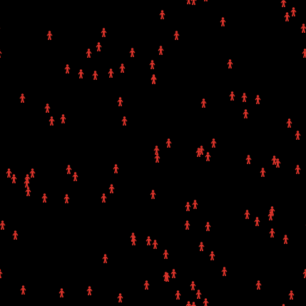 to setup clear-all create-turtles 100 [ setxy random-xcor random-ycor set shape "person" set color yellow ] ask one-of turtles [ set color red ] reset-ticks end to go ask turtles [ set heading random 360 fd 1 if any? other turtles-here with [color = red] [set color red] ] tick end