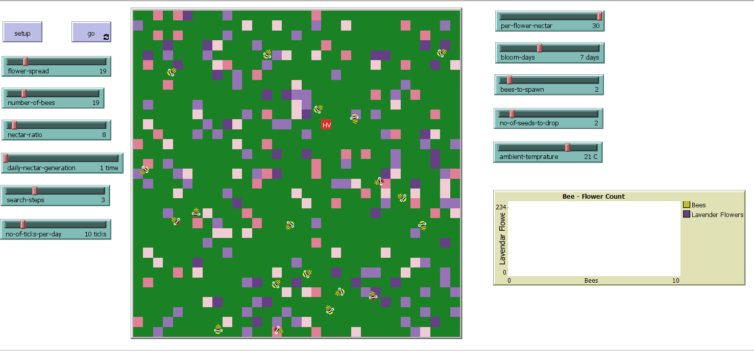This model simulates the dynamic interactions between a colony of honeybees and a field of lavender flowering plants, focusing on the process of pollination. It aims to demonstrate how bee foraging behaviour influences the reproductive success and population of lavender plants, and conversely how flower availability and characteristics (like nectar presence and gender) affect bee activity and survival. The model also incorporates the influence of ambient temperature, on bee foraging efficiency and population growth, providing insights into the delicate balance required for a healthy bee-flower ecosystem.