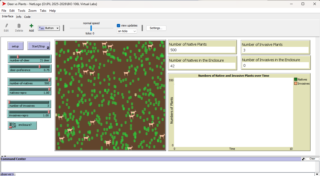Users can place a 10 X 10 enclosure on the landscape which prevents deer from browsing any plants within it. Users can track the numbers of each type of plant over time displayed as counts for both the world overall and for the space inside the enclosure. Comparing these numbers can inform the user of the effect of the enclosure on plant populations. The model also plots the total number of natives and invasives over time.